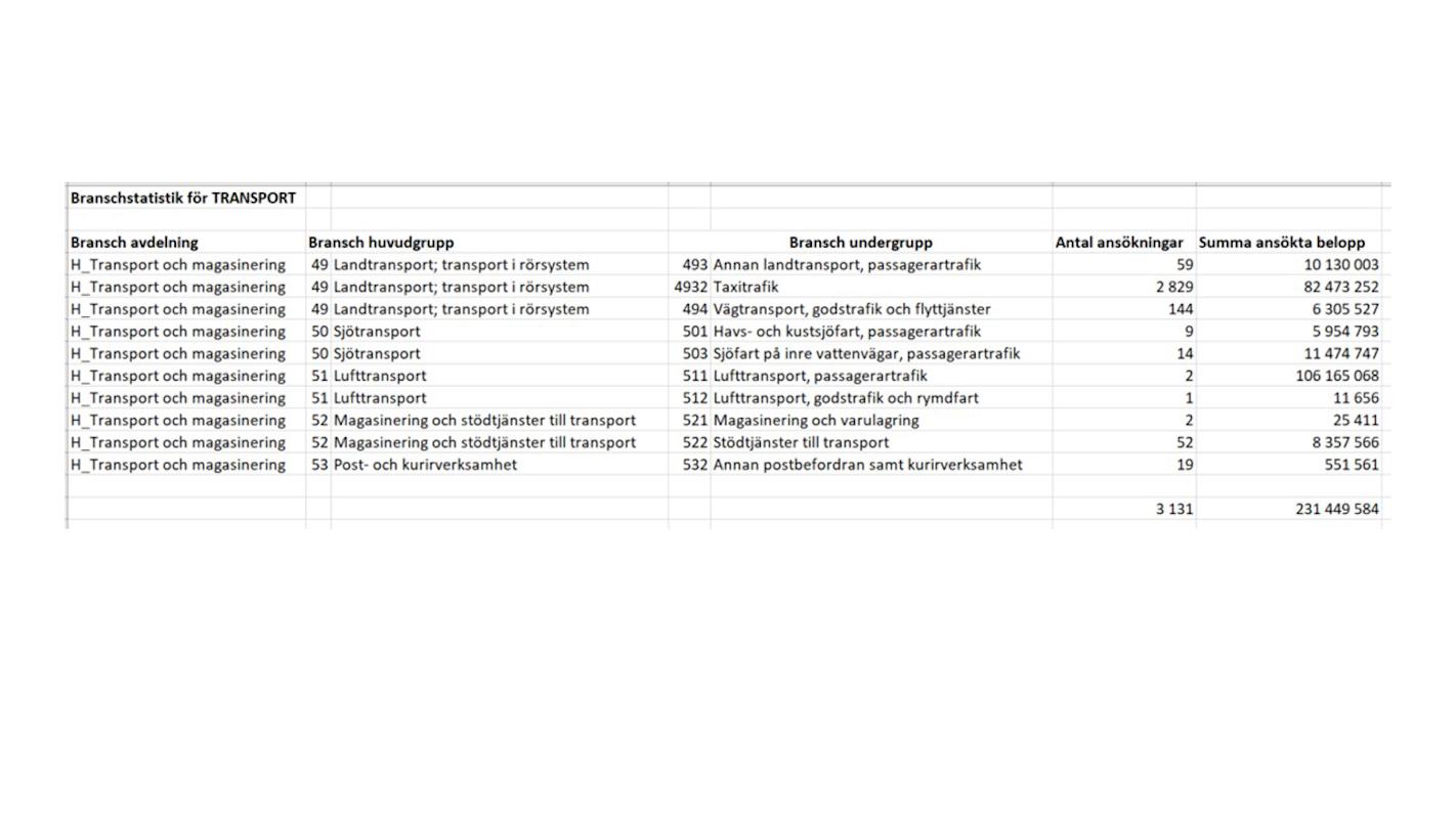 Tittar vi däremot på hur mycket pengar som ansökts inom olika branscher av transportsektorn förändras bilden. Då är flygsektorn – passagerartrafik - den bransch som ansökt om mest pengar i omställningsstöd och taxi kommer på andra plats. Passagerartrafik på inre vattenvägar ligger på tredje plats och bussbranschen på fjärde.