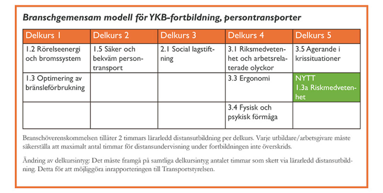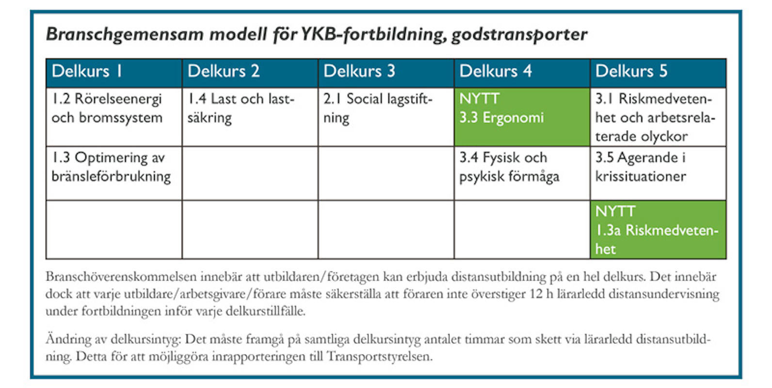 Förordning (2020:302). - Fortbildningen ska vara anpassad till den enskilda förarens utbildningsbehov och till den senaste utvecklingen inom relevant teknik och reglering. Fortbildningen ska innehålla minst en delkurs i trafiksäkerhet. Detta motsvarar delkurs 5 i den branschgemensamma modellen för ykb-fortbildningen