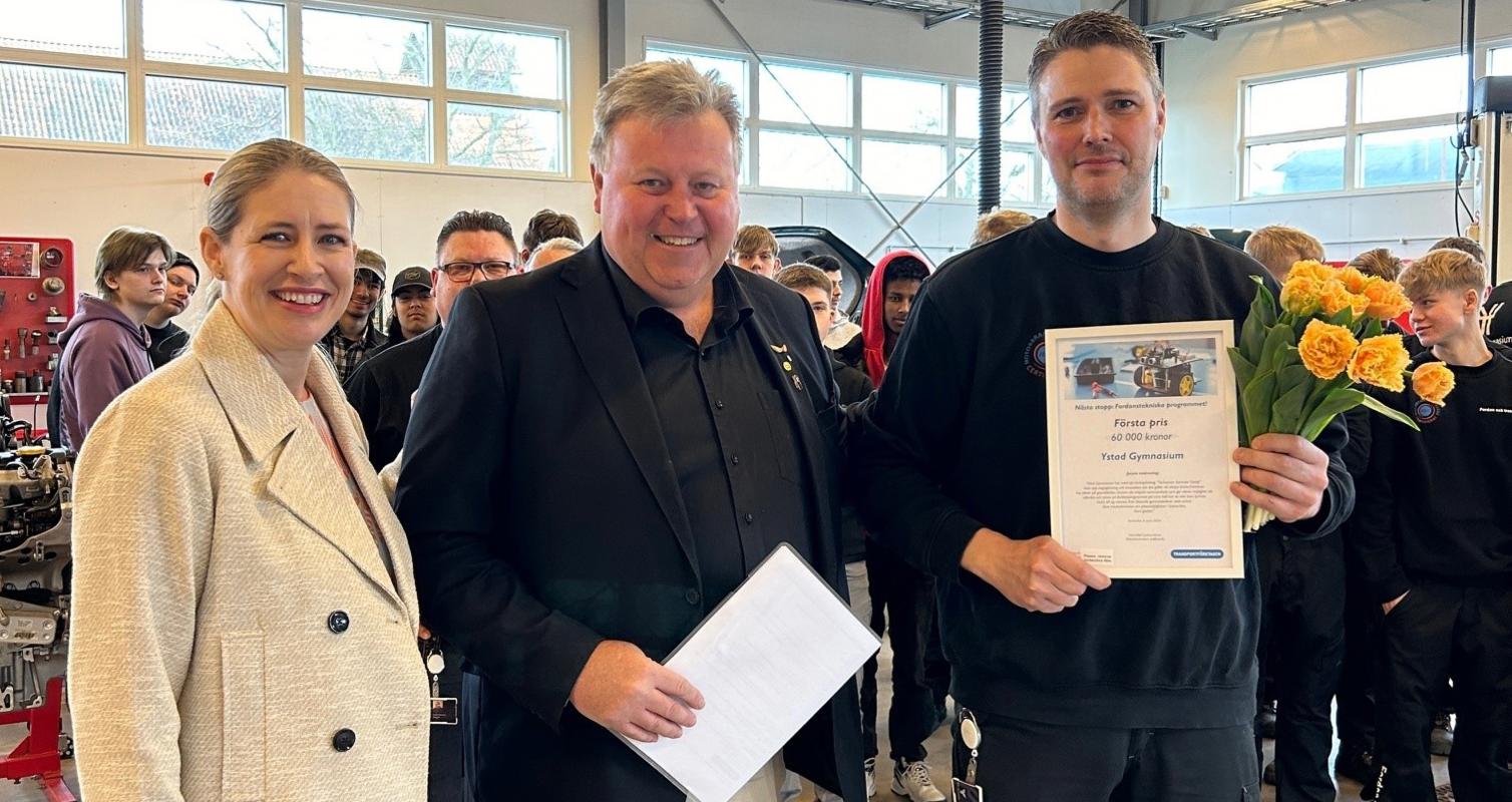 I dag fanns representanter från Transportföretagen på plats i Ystad tillsammans med Svenne Gudmundsson, ordförande för Motorbranschens Arbetsgivareförbund, för att dela ut förstapriset i tävlingen Nästa stopp: Fordonstekniska programmet! Årets vinnare är Ystads gymnasium, som belönas med 60 000 kronor för projektet ”Technician Summer Camp”. Det är en sommarskola, som syftar till att öka intresset för fordonsprogrammet och branschen, hos elever i årskurs 8.