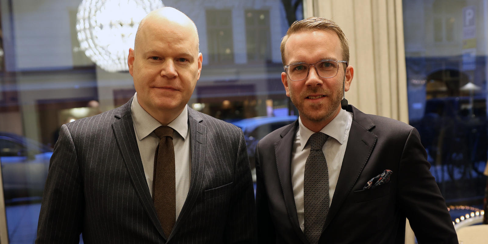 Transportföretagens vd Marcus Dahlsten tillsammans med infrastrukturminister Andreas Carlson (KD).