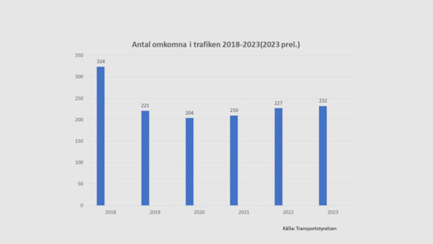 Under fjolåret omkom 232 personer i vägtrafiken, vilket är fem fler jämfört med 2022. Det visar Transportstyrelsens preliminära statistik som presenterades i mitten av januari. 1792 personer skadades svårt och 12 769 blev lindrigt skadade i trafiken.