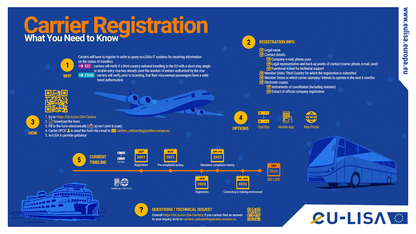 Sveriges Bussföretag deltar i de upprättade arbetsgrupper för transportörer som finns, för att kunna ta del av information om hur arbetet fortskrider och vilka konsekvenser det får för svenska bussföretag. EU-lagstiftningen kring EES och ETIAS är bindande för alla medlemsstater.