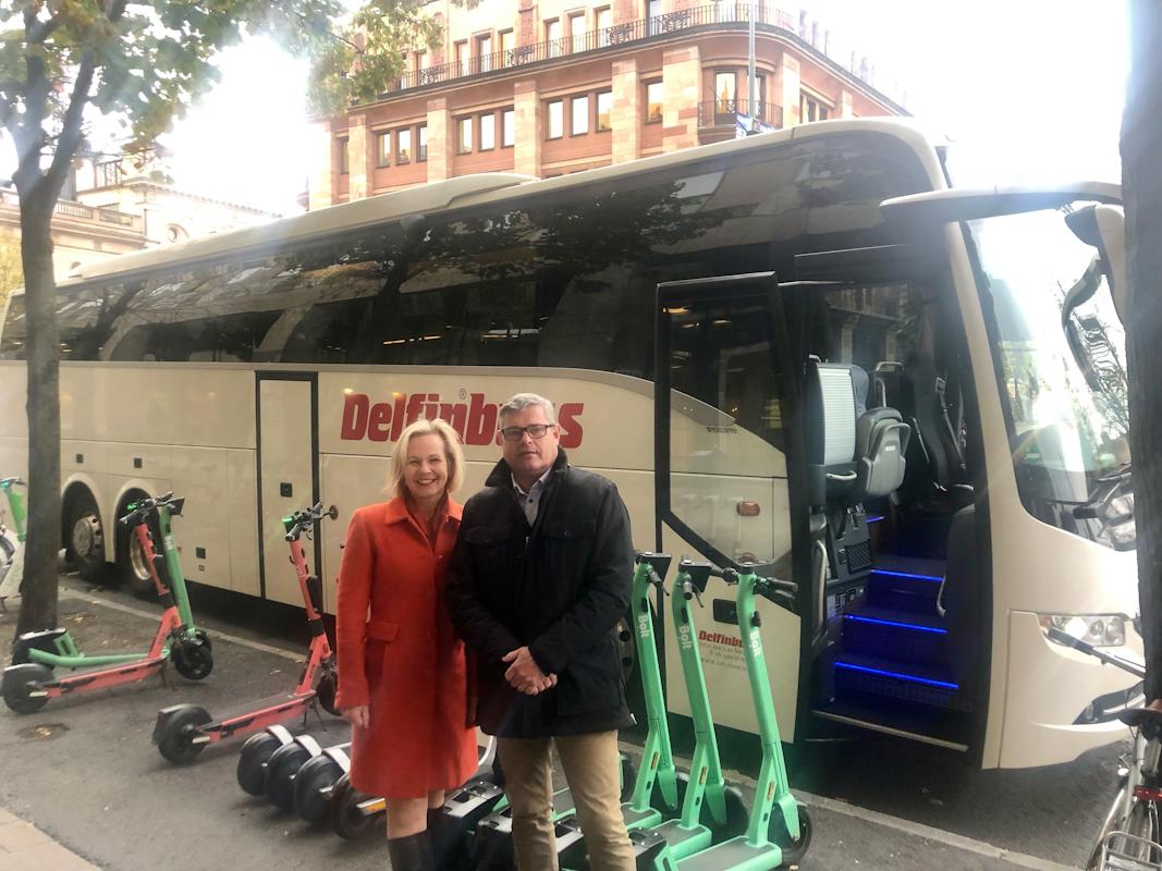 Bildtext: Pär Åkerberg, regionalt ansvarig i Sveriges Bussföretags Stockholmsavdelning och Anna Grönlund, branschchef Sveriges Bussföretag utanför bussen precis innan avgång vid tisdagens bussrundtur i Stockholm.