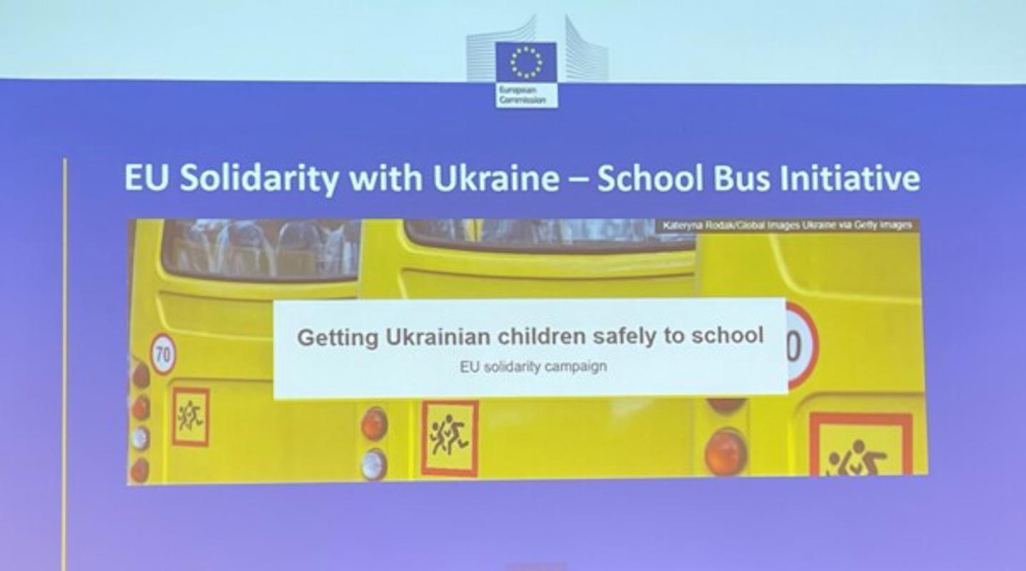 För att se till att skolbarn kan ta sig till en fungerande skolbyggnad har EU-kommissionen lanserat ett projekt för privata och offentliga aktörer ska kunna donera skolbussar till Ukraina. Satsningen är en del av ett större initiativ för att stötta utbildningssystemet i Ukraina där EU bland annat har donerat 100 miljoner euro för återuppbyggnad av skolor. EU går också in med 14 miljoner specifikt för skolbussprojektet. Hittills har 240 bussar blivit donerade – Finland har till exempel redan skickat ett flertal bussar.
