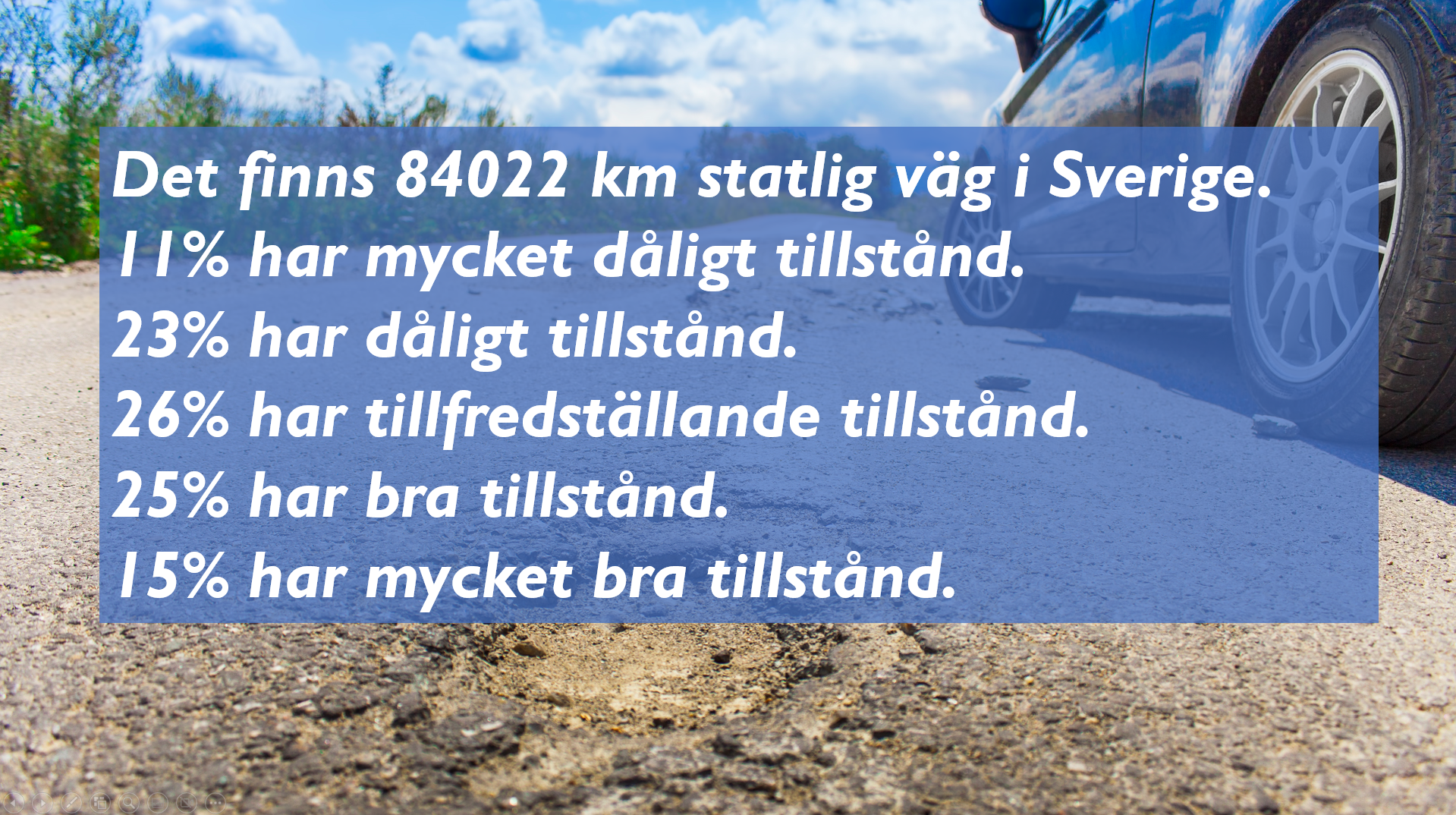 Det svenska vägnätet förfaller i snabb takt. Sverige behöver satsa mer på vägunderhåll. Vi har en underhållsskuld på våra statliga vägar på omkring 17 miljarder kronor år 2022. Skulden beräknas växa till 42 miljarder kronor 2032 om inte ytterligare medel tillförs vägunderhållet.